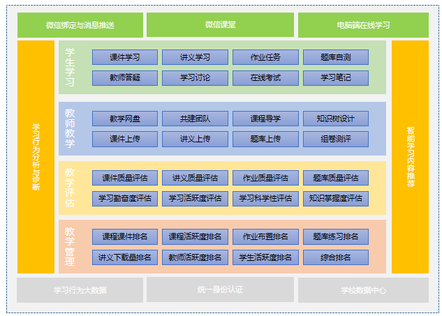 同时,智慧学习平台和微信深度融合,实现微信端在线学习和微信消息推送,保障学生学习提醒和通知无障碍送达。软件功能架构如下图所示: