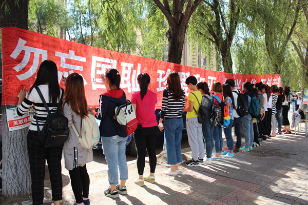 主办的“勿忘国耻 珍爱和平 振兴中华 开创未来 ”的系列活动于2015年9月17日、18日成功举办。2015年9月17日上午12时40分在一食堂门前广场隆重举行了系列活动(一)——众人签名活动。每一个笔画都代表着教科学子报效祖国的决心,都浸润着师大人炽热的爱国情怀。