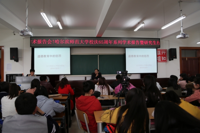 师生进行交流与分享。傅教授从没有惩罚的教育是不完整的教育、社会范畴与教育范畴中惩罚的同质与差异、教育中惩罚使用的范围界线、教育领域中惩罚的执行四个方面作出自己的解读,发表了正确的惩罚是保证教育活动有序有效进行的必要手段、惩罚是帮助学生适时有效地完成社会化的必要手段、在人道德发展的一定阶段恰当的使用惩罚符合人道德发展的一般规律、奖励和惩罚的教育功能都是有限的等一系列观点,傅教授结合其多年的一线教师亲身经历,结合具体教学实例,深入浅出的将道德教育中的惩罚问题表达的淋漓尽致,语言幽默诙谐,表达方式旁征博引,引得师生阵阵掌声与喝彩。