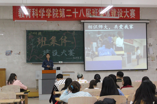 本次比赛以班级为单位,面向2014、2015级各个班级展开。评比内容包括ppt展示、演讲、纸质材料三部分。比赛在活力四射的开场舞《hate》中拉开帷幕,各个班级展示他们的独有风采,ppt生动风趣并有内涵,新意层出不穷,精心录制的视频记录了他们一路走来的点点滴滴,哭过笑过,彼此始终在身边,亲如一家。同时,更有个别班级独特的“加分”表演,2014级教育二班改编的小品《王妃》、以及小学教育二班改编的歌曲《小幸运》都将此次比赛一次又一次引向高潮。班级同学亲手制作纸质版相册,有细致的珠绣、巧妙的手工剪纸、娟秀的文字、绚丽的彩绘、还有充满创意的“礼盒”相册、“帆船”相册,纸质的展示丰富多彩,让人目不暇接。各班同学经过精心的准备,向评委和观众们展示了一幅幅温馨动人的画面。