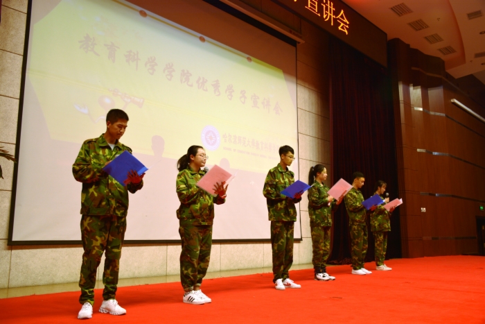 本次活动由2016级教育技术专业班级班长、校运动会多个项目获奖者、体育部副部长隋世伟,2014级“感动校园十佳大学生”塔吉古丽,2014级安亚教育咨询有限公司联合创始人赵鹏,2013级推免研究生高瑞洁,2012级推免研究生、“感动校园十佳大学生”陈健敏五位不同年级的优秀同学向新生们介绍自己大学生活中的学习经验与技巧以及生活上的感悟。师大是一个良好的舞台,只要有想法并付诸实践就有机会实现自己的梦想。五位优秀学子也激励学弟学妹们要敢于迎难而上,有坚韧不拔的精神,为青春,为自己搏出一份无怨无悔。
