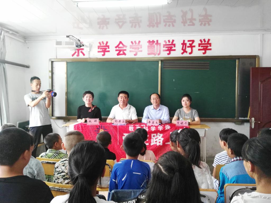 党委书记辛显文与中心校校长杨井岳分别致辞。仪式结束后,志愿者们将准备好的书包、书本、画笔等学习用品捐赠给各位同学,孩子们看着新颖的文具,眼睛里散发出了喜悦的光芒,并对志愿者们表示感谢。