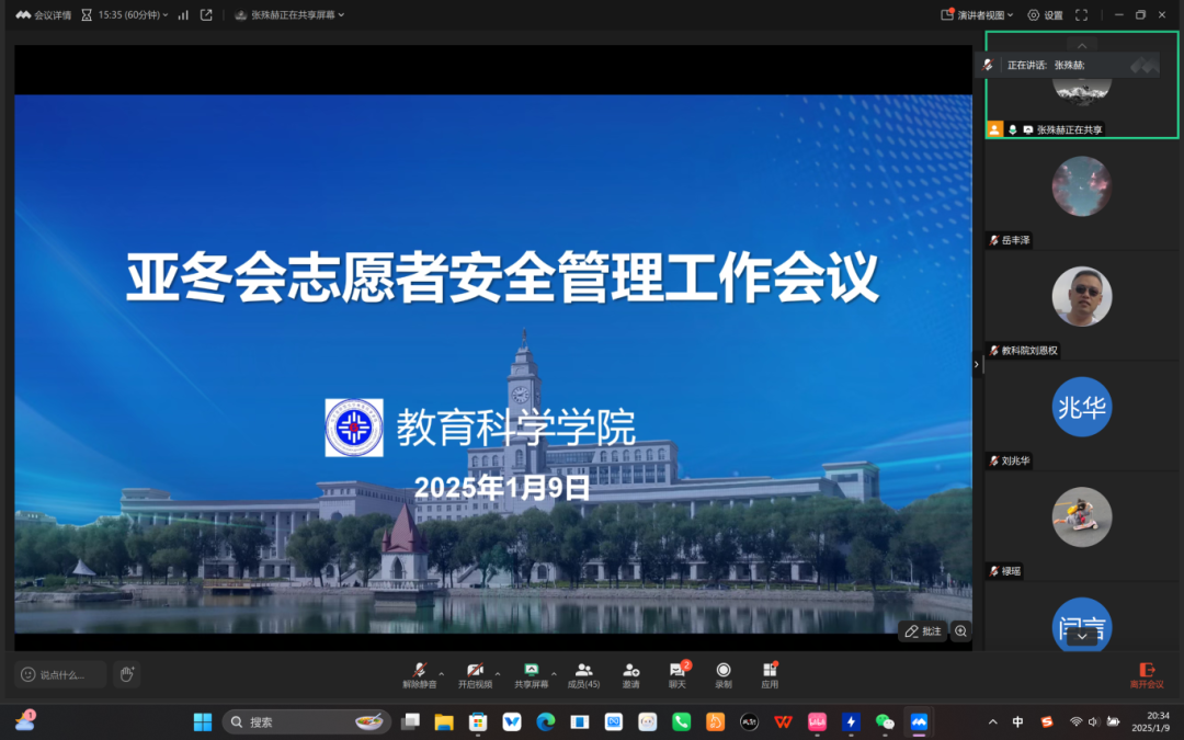为推动亚冬会志愿者服务保障和护航亚冬安全工作实施,贯彻落实《2025年第九届亚冬会哈尔滨师范大学志愿者服务保障方案》,英超足球直播 于1920:30线上召开亚冬会志愿者安全管理工作会议,英超足球直播 党委书记刘兆华,副处级辅导员刘恩权,2024级辅导员赵五洲,20222023级辅导员王志宇、史俊婷,亚冬会全体志愿者参加本次会议。本次会议由2024级辅导员张殊赫主持。
